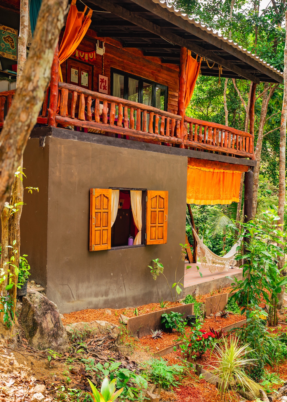 Eco Jungle Bungalows overlooking Haad Salad, nestled high in the mountain forest, immersed in the sounds of birds, wind, and pure island nature. Each bungalow includes a double bed, private bathroom with hot shower, mosquito net, balcony, and hammock. Naturally cooled by jungle shade and fresh breezes (no A/C). Just 3 minutes from Haad Yao and Haad Salad beaches. Guests also enjoy free access to our world-renowned Ecstatic Dance in the Pyramid Shala.