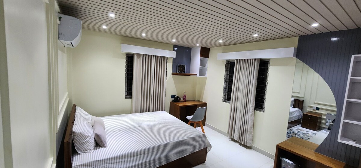 This cozy 4th-floor home combines comfort and convenience with a bright bedroom, wall cabinet, seating area with TV, prayer room, workstation, and dining space. The kitchen includes a fridge, oven, and HI-TECH water filter for easy living. Essentials like geyser, Wi-Fi, and AC in both bedroom & living area ensure comfort. Located next to Gulshan Aarong outlet and walking distance to food shops, it’s perfect for quiet reading, working from home, or simply relaxing for maximum 2 people.