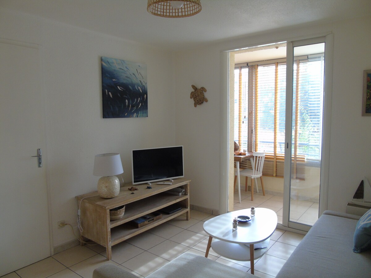 Located on the bay of Portissol and a ten-minute walk from the port, this charming studio is fully equipped: dishwasher, microwave oven, kettle, coffee maker, toaster, refrigerator, washing machine, iron, new sofa bed with 23 cm thick mattress, ceiling fan, TV with TNT channels and fiber Wi-Fi, sheltered terrace, free placement at the edge of the residence. Only 2 floors without elevator for this residence located in a quiet, residential and very wooded area.