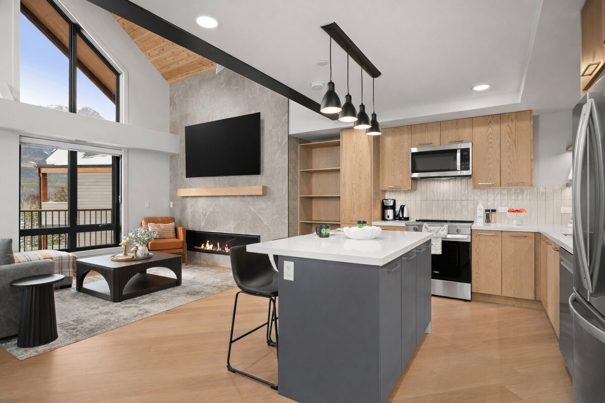 This newly constructed top-floor suite offers an exceptional living experience with breathtaking mountain views. Enjoy premium amenities like the communal rooftop hot tubs or the custom-built wet sauna. Host a BBQ and unwind on your two expansive private balconies. As night falls, gather around the fire table and marvel at the starry skies. Just a short drive from Banff, this property blends luxury and convenience for the ideal mountain getaway.