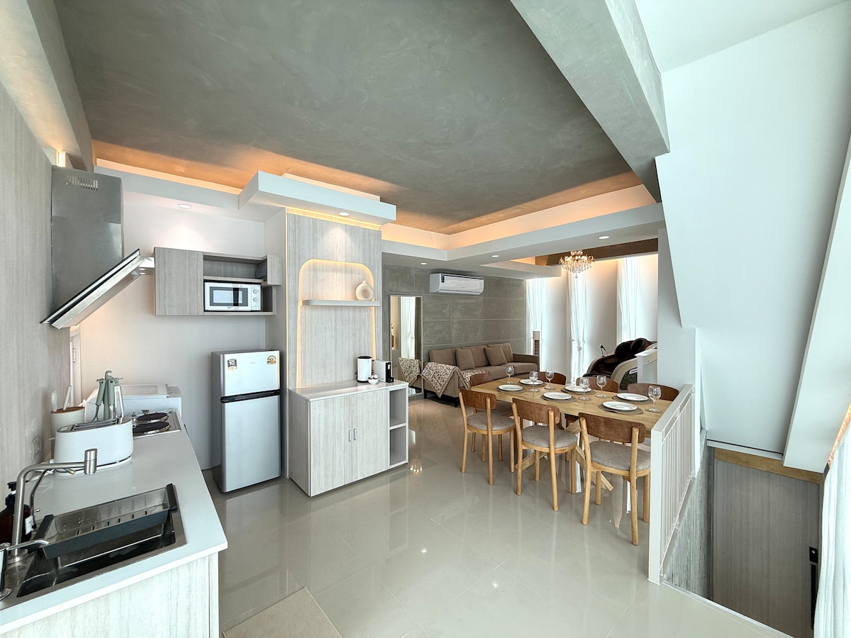 Unwind in our peaceful, thoughtfully designed townhouse. This artistic loft features a state-of-the-art kitchen, spacious bedrooms with large wardrobes, luxurious dual rain showers, PM2.5 ACs, and a 75" TV with video games. Surrounded by creative touches like art, poetry, and photography, it’s a haven of comfort with everything you need. Enjoy high-speed Wi-Fi, dual lighting, and optional transportation for a seamless stay.