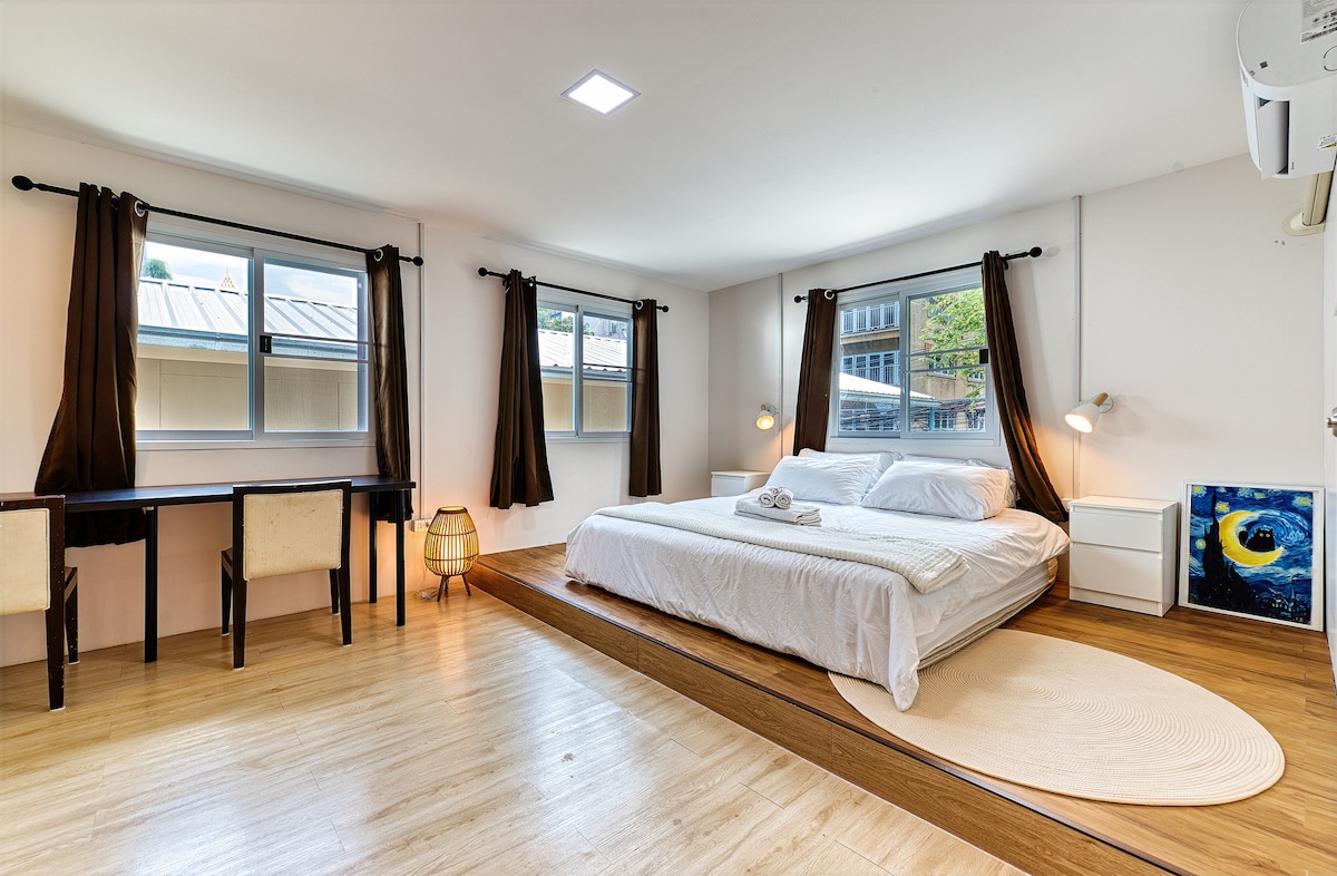 A spacious entire apartment with private bath, kitchenette, living/dining, 1 bedroom with designated working area, and balcony. Enjoy the wide windows for uninterrupted views and plenty of sunlight, increasing airiness for a more relaxing stay. Enjoy all the conveniences of city-life, including: - 2 min to MRT Samyan - 5 min to BTS Silom, MRT Sala Daeng - 5 min to Samyan Mitrtown, Chula U. Silom Complex, Thaniya, Patpong, 7-11 - Lots of food, cafe and taxi/bikes