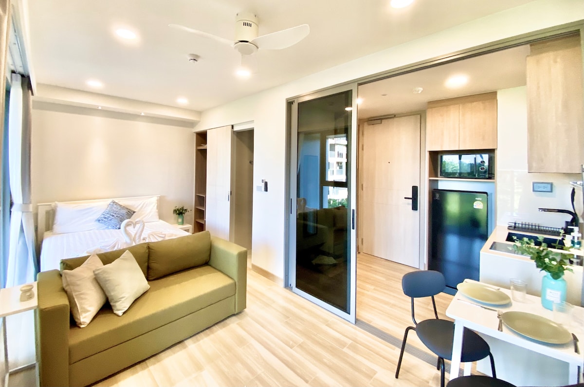 New cozy studio with golf yard view in a the center of the high-end community of Laguna Phuket. 700 meters to Bangtao Beach. Studio room type 30 SQ.M - Equipped kitchen with refrigerator, stove, microwave, kettle, toaster - King size bed - Sofa-bed - 50-inches smart TV - High speed Wi-Fi - Hair dryer - Ironing board + iron - Balcony with facing to incredibly green view