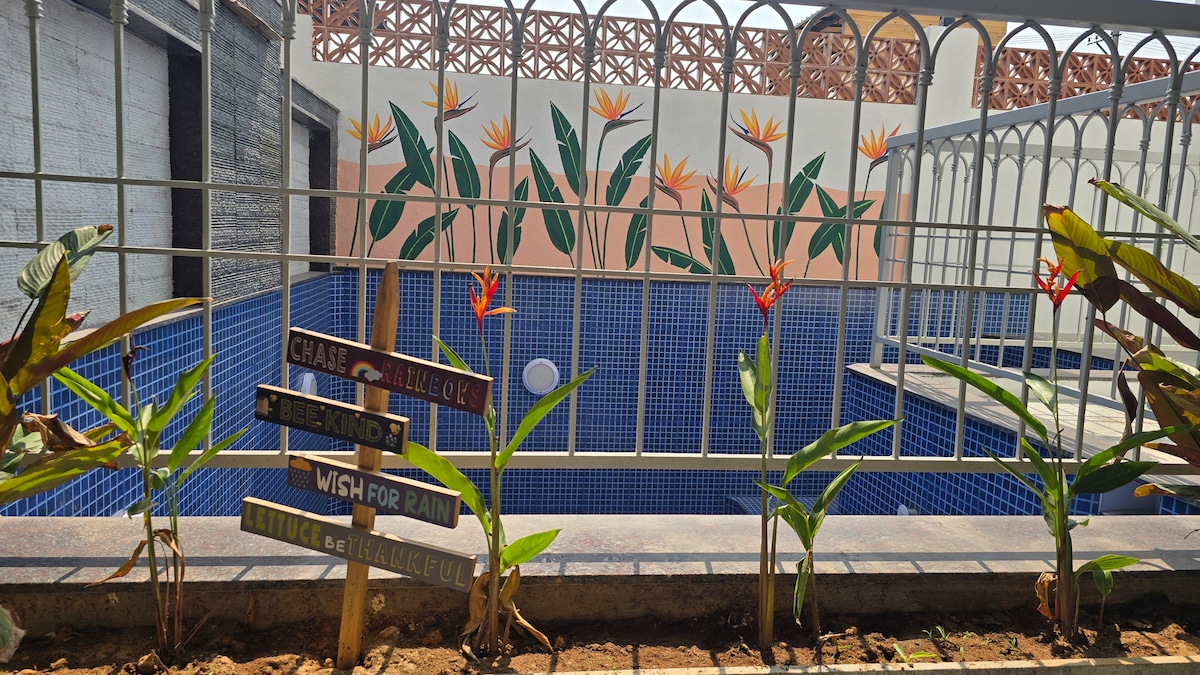 Welcome to 'pool n sway' a uniquely styled penthouse guest suite with a exclusive to unit private plunge pool. A place done up to best suit & provide a great stay! Airy, bright n' beautiful is what you might say. A cozy private pool is certain to bring in joy, topped up with an experience of sunroom, a large antique swing, extended to patio, is sure to tick few checkboxes on your wish list
