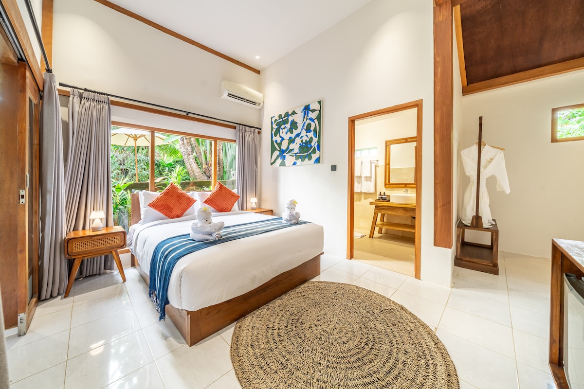 Tranquil 1BR hideaway in Ubud’s Penestanan / Sayan area: • 1 cozy air-conditioned bedroom with garden views • Bathroom with walk-in shower + amenities • Private patio with seating — perfect for morning coffee • Lush tropical garden setting • 2 swimming pools (shared) for sun time & relaxing dips • Daily cleaning with fresh towels & linens • Calm, green surroundings — made for rest and reset • 300 Mbps Wi-Fi • Netflix & PS5, baby amenities on request • Concierge service for tours, spa & more