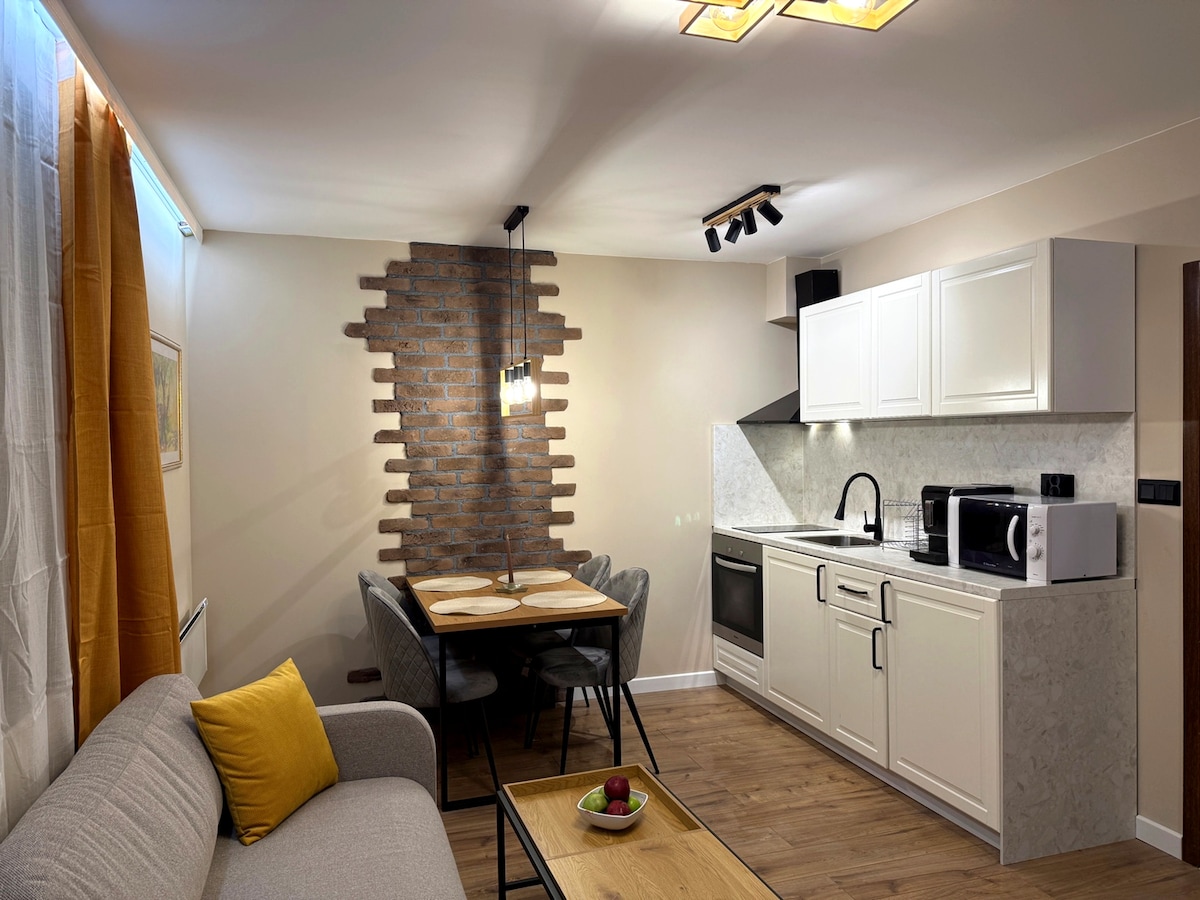 Enjoy a small cozy apartment in a quiet and communicative place. At your disposal is a bedroom with the possibility of providing a children's crib, a spacious living room with a fold-out sofa, a fully equipped kitchen and TVs in each room. Free private parking is available to guests.