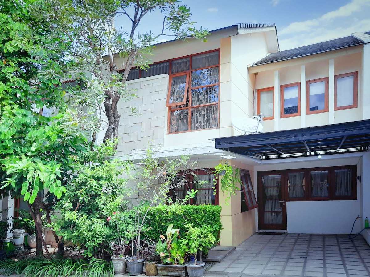 Located in a comfortable and beautiful housing, one gate system and wide neighborhood roads, perfect for staying with family or friends. *Full 1 Home Amenities *, contains : 3 Bedrooms ( all air-conditioned ) 2 Bathrooms , 1 of which has a bathtub 1 Kitchen and utensils 1 Living room 1 Living Room 1 40" TV 1 Gallon of mineral water WiFi Water heater Refrigerator 24-hour security Garden and carport The estate pool costs 15k for 1x swimming and requires a swimsuit