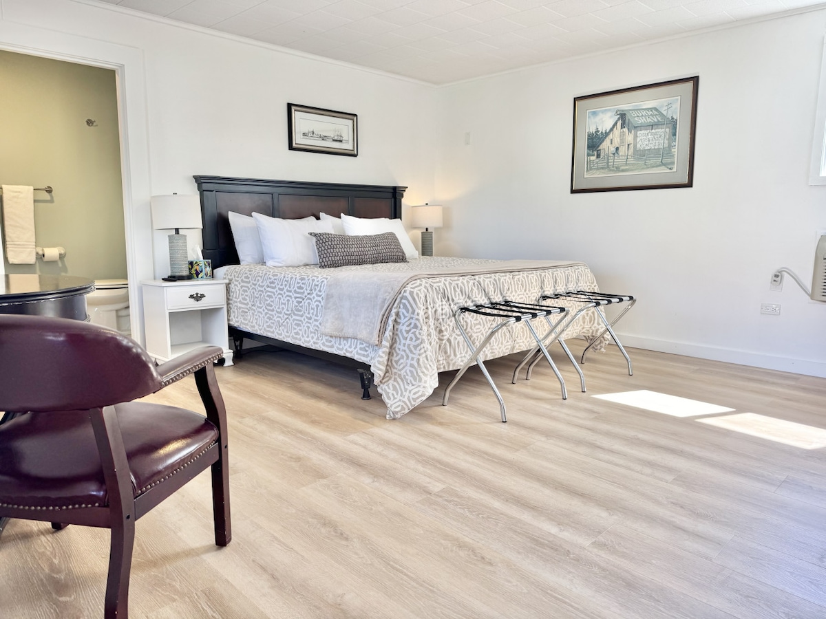 This comfortable, larger sized suite with a king bed features a full bathroom, dedicated parking, and amenities including a full sink, microwave, refrigerator, free wi-fi, and a Smart-TV. Also included is a large common greenspace with lawn chairs, propane grills, and a private dog-park. An ocean beach, several restaurants, a general store, and a specialty wine and cheese shop are within easy walking distance.