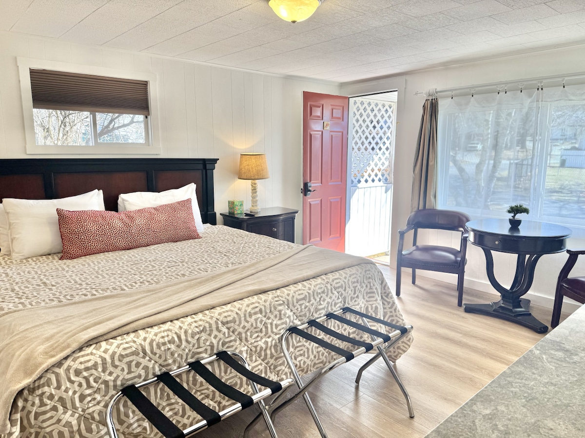 **NEWLY RENOVATED** This comfortable king room features a full bathroom, dedicated parking, and amenities including a microwave, refrigerator, free wi-fi, and a Smart-TV. Also included is a large common greenspace with lawn chairs, propane grills, and a private dog-park. An ocean beach, several restaurants, a general store, and a specialty wine and cheese shop are within easy walking distance.