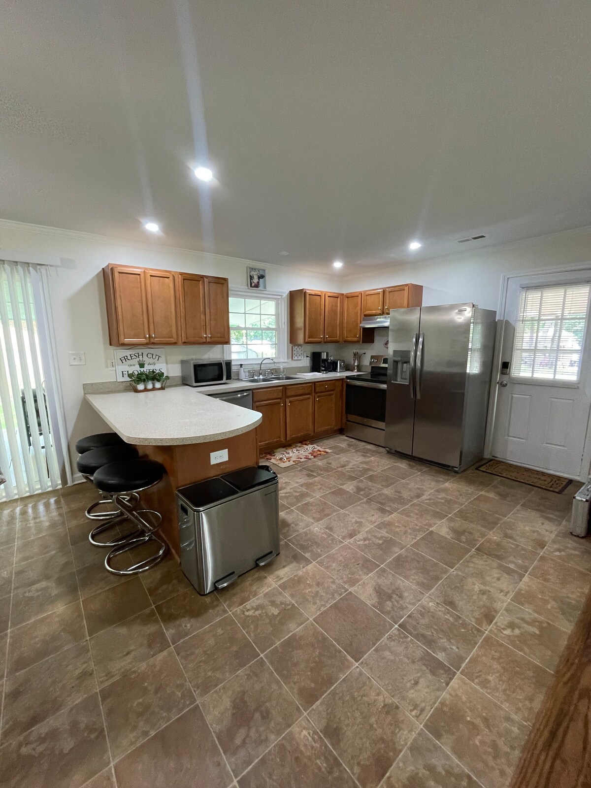 You'll love or Carriage House. Full kitchen with oven, French door refrigerator, stove, microwave. Has an island where you can eat or a dining table with 4 chairs. Washer and drier. Dedicated workspace. Large sectional sofa and coffee table. Entertainment includes 55 in Smart TV & High speed internet Queen bed & all linens. Also cotton sheets Bath has walk in frameless shower. Entire space is well lit. A place you'll visit again & again. Comfort in the country. We welcome you to our place.