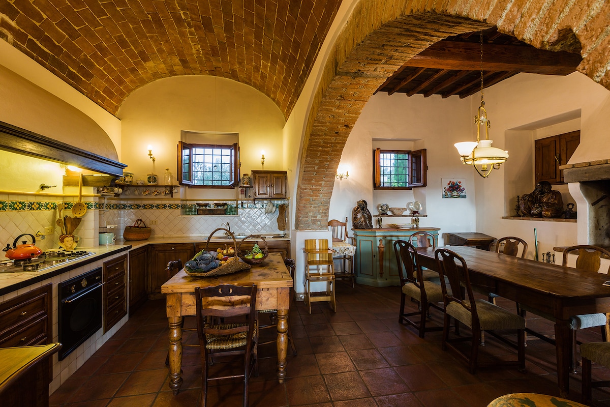 Podere Vergianoni is an ancient and authentic farmhouse dating back to the 17th century located in the beautiful hills of Chianti in Tuscany. The apartment is impeccably furnished in the traditional local style of old Tuscany: ancient wooden beams, terracotta floors, and unique furniture. In the large outdoor courtyard, you'll find a large swimming pool on a panoramic terrace at your disposal, overlooking the valley with breathtaking views of vineyards and olive groves, where you can enjoy spectacular sunsets.