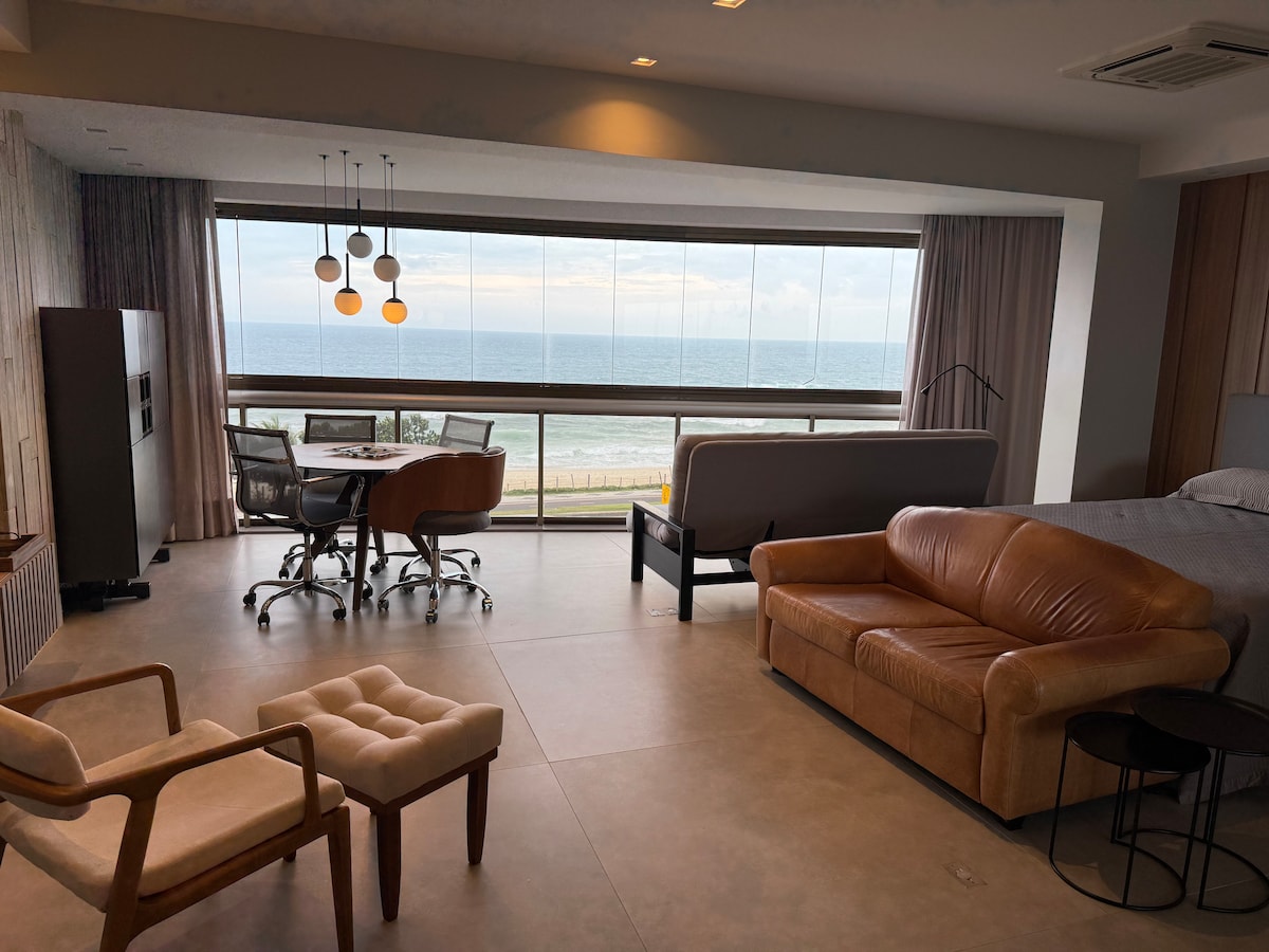 Discover sophistication and comfort in this boutique apartment, decorated by a renowned architect. Fully equipped, with partial beach view, is perfect for business and leisure. Kitchen complete with filtered water, 24-hour security, swimming pool, sauna, whirlpool, restaurant, hairdresser and gym. Easy access to shopping malls and local shops.1 minute to the beach by foot. * 3 Hospede is on the double sofa bed in the living room with Air-Conditioning.*