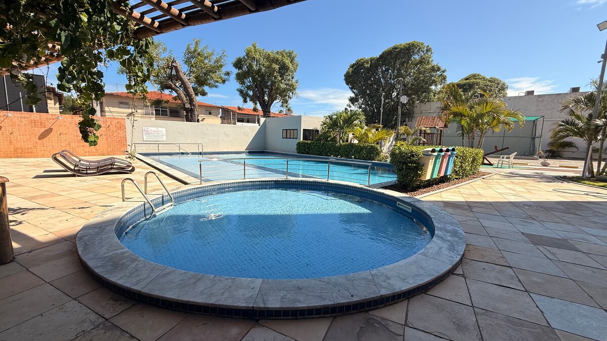 Full and well-equipped apartment in club condominium, with swimming pools. It has two en-suite bedrooms, a double bed, two single beds and two extra mattresses. Fully equipped kitchen: electric kettle, microwave, sandwich maker, blender, air fryer and other utensils. The apartment is on the second floor, with elevator access. Balcony overlooking the wooded outdoor area. Ideal for families. It is located in Barra de São Miguel, close to the French beach and Gunga beach.