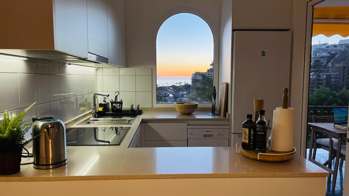Fin og romslig leilighet med 2 soverom, privat takterrasse med sol fra morgen til kveld. TV, Apple TV, fiber/internet Flott utsikt over havet, Tenerife, Teide, Balito og Puerto Rico. Sol fra formiddag, til den går ned i havet på verandaen. 3 basseng i anlegget med adgangskort. Cafe, bar, lite lokalt supermarked, bilutleie, tennis/håndball/basketball-bane i anlegget. Kort avstand til restauranter, barer, kjøpesenter, buss/taxi, og den offentlige Anfi-stranden Heis ned til strandpromenaden