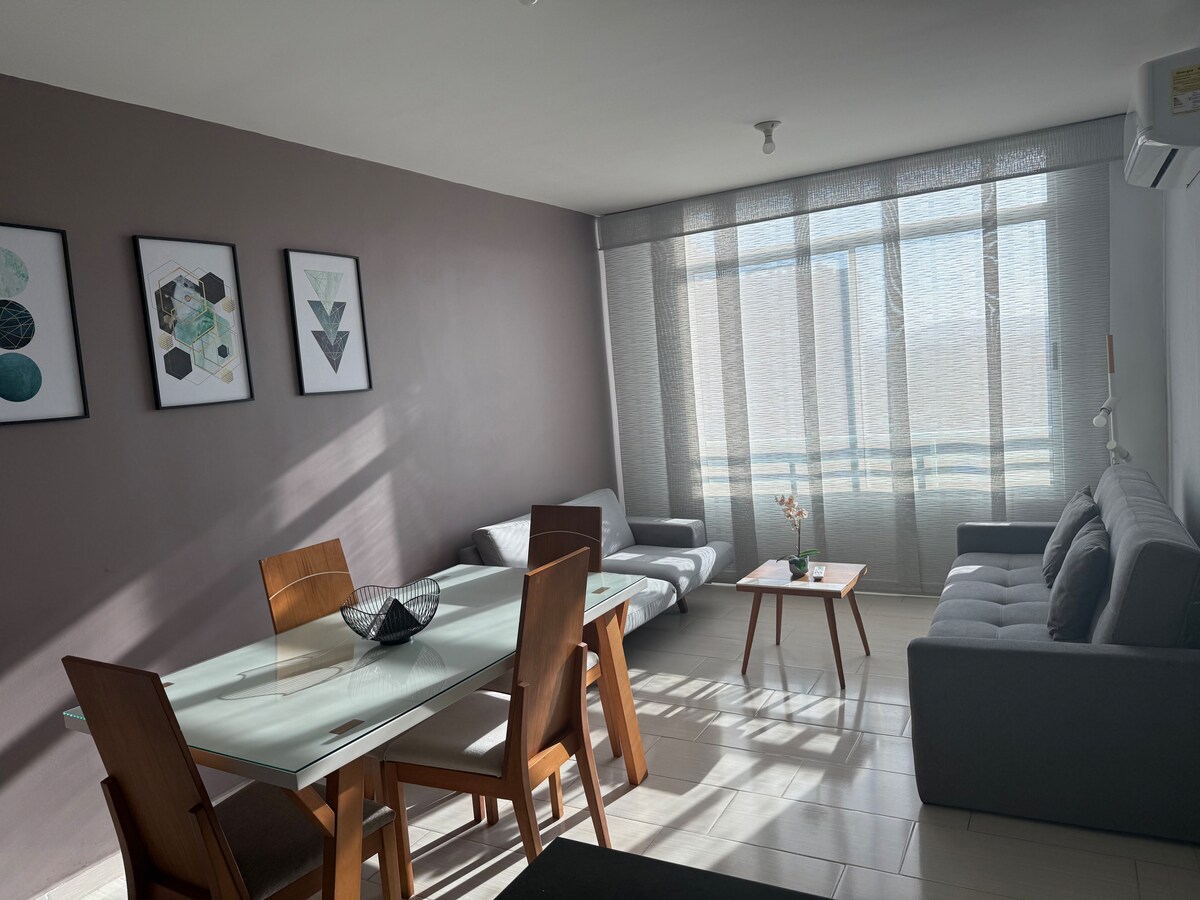 Relax in this quiet and elegant space, very cozy, you won't want to leave! Apartment located in a complex with a swimming pool, 11th floor with 1 bedroom with a double bed, air conditioning, internal bathroom, TV, living room, dining room, with a guest bathroom, coffee maker; each space is designed to make you feel in a different environment than at home but with the comfort as if you were in it, we will make your stay pleasant. We look forward to seeing you!