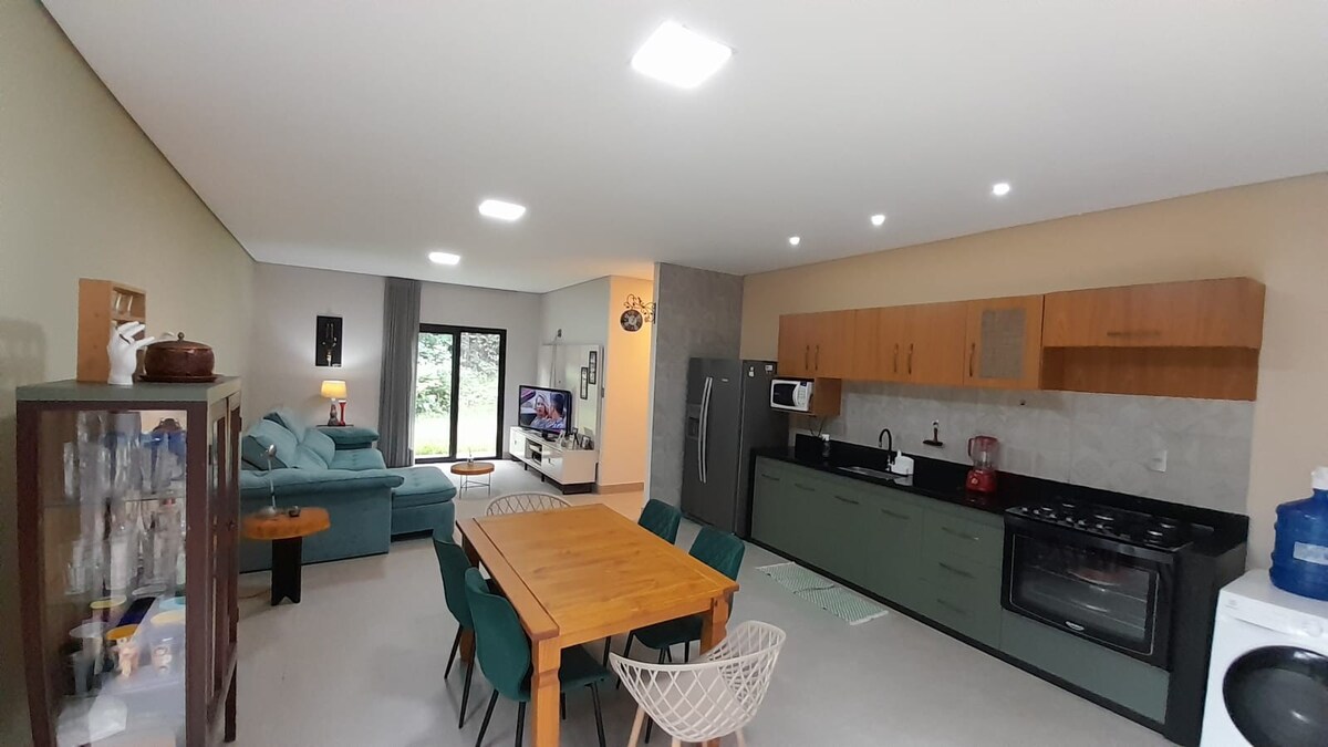 Two bedrooms, 2 bathrooms, kitchen integrated with the dining and living room, TV with movies, Internet, surrounded by forest, wild animals, private lake, outdoor fireplace, thatched roof, barbecue, close to restaurants, pharmacy, Aldeia shops. Enjoy the silence of the forest, space for walking and running, bring your bike, enjoy unique landscapes and integration with nature. Bring towels, bedding, blankets. The house has kitchen utensils, pots, blender, wine cellar.