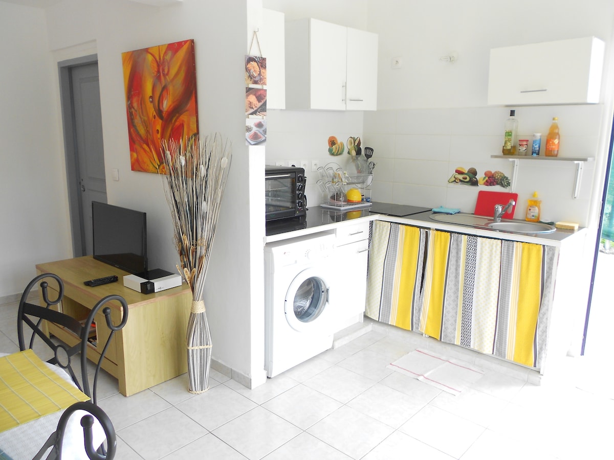 Studio with terrace, equipped kitchen, sea view, parking space, located in a residence with infinity pool overlooking the Îlet du Gosier. The residence is secure and is located in the village of Le Gosier; 10 minutes walk from the beach of the datcha, restaurants and shops. The place is ideal for a couple on vacation. The studio has an oven, microwave, coffee machine, washing machine, fridge, TV, WI-FI.