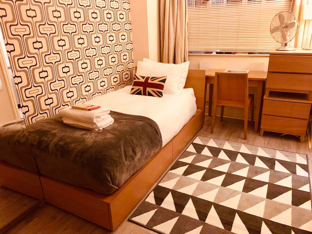 This ground-floor flat is warm in the winter and cool in the summer! It offers two bedrooms, one with 2 single beds and another with 1 standard-size double bed. The double room is next to the bathroom and opens out into a quiet L-shaped walled garden. This is a lived-in 'home from home' as guests often point out. I hand over the keys and stay elsewhere but am always contactable. Visitors to London who prefer the exclusivity of a purpose-built apartment or hotel room should not come here!