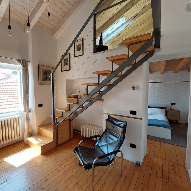 Bright lakeside apartment with stunning views of the lake and mountains. Renovated in Scandinavian style, it has a spacious open-plan area (living, dining, kitchen), three bedrooms, two bathrooms (one is 0.80 sqm), a balcony, and a large terrace. This is my home, filled with my original artworks. As an artist, I prioritize ecology and recycling. Free parking is available. Perfect for a relaxing stay on Lago Maggiore, blending nature, art, and sustainability.