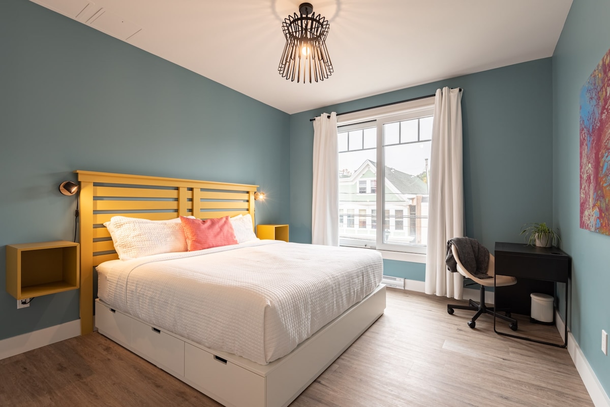 Located in the heart of Downtown Wolfville, Suite 204 is our accessible suite that is a spacious two bedroom layout perfect for a group or two couples. With a balcony and views of Cape Blomidon you can't go wrong. This suite uniquely has accessibility features and the building has an elevator for added comfort and ease during your stay. With a full kitchen, rainfall shower head, 55" Smart TV, comfortable furnishings, washer & dryer, large windows, you'll wish you never had to leave!