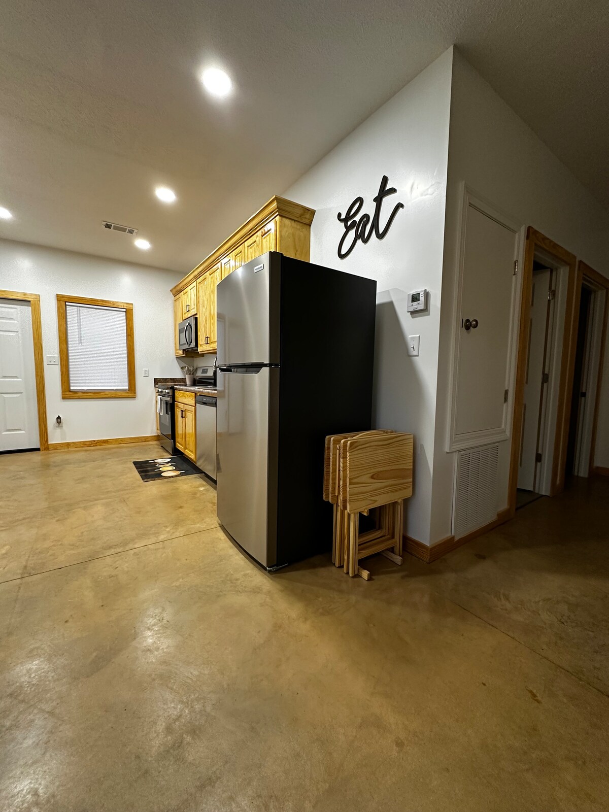 The 2 bedroom, 1 bath cabin has an open floor plan in the den and kitchen, a queen size bed in the master bedroom and twin beds in the second bedroom, with a roll-away daybed available. A pack n play is available upon request. The bathroom is handicapped accessible. The kitchen is equipped with a gas stove, full size refrigerator and microwave. There is no dishwasher. There is a flat screen tv in both the den and the master bedroom with Directv. We have WIFI available.