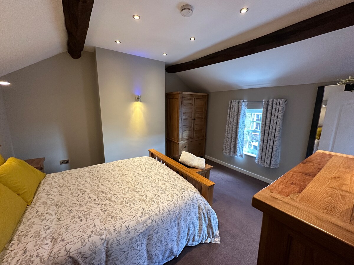 Ground floor sitting room , kitchen dining area, a log burning stove to relax by the fire,use in Winter only. Kitchen - bespoke cabinets, a granite worktop with electric Aga. An open plan style living/dining room bespoke dining table. Oak staircase to the first floor landing, master bedroom with king size bed, velvet padded headboard , a large round window has incredible views, true luxury. A seperate contemporary bathroom room, with a shower over bath, washbasin, wc and a heated towel rail.