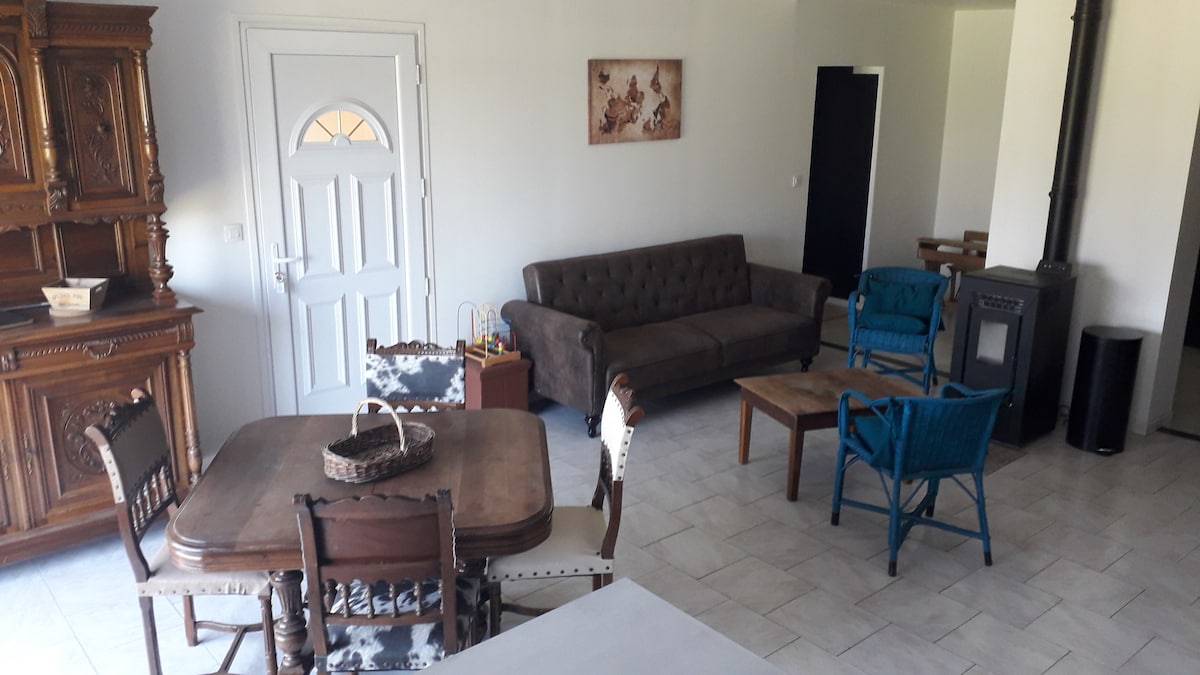 Chaleureux et convivial dans un cadre bucolique. Chambres confortables, séjour spacieux, grande cuisine bien équipée, le jardin, son plan d'eau, terrasse, aire de jeu, barbecue... et la grange avec ping pong, table de banquet... Idéal pour vos événements familiaux, retrouvailles entre amis, déplacement professionnel... En option une 6ème chambre double et panier petit déjeuner 8€/personne à réserver 48h avant. Nous sommes à votre disposition pour toute demande particulière.