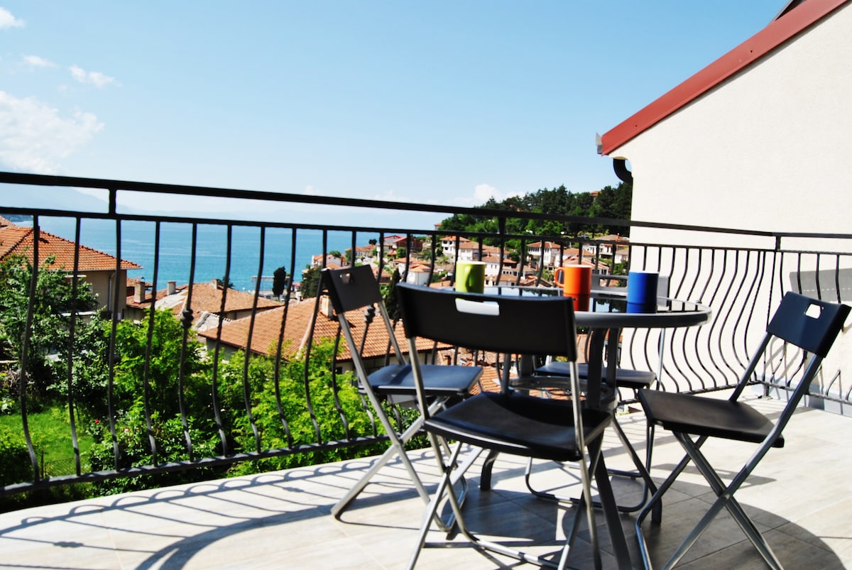 Located right in the heart of old town this Beautiful and Cozy Studio will give you true romantic and comfy feeling with it's big balcony and breathtaking Panoramic Views over the Lake, Cathedral church of saint Sophia and old town. Has well equipped kitchen, air conditioning & private bathroom with shower.