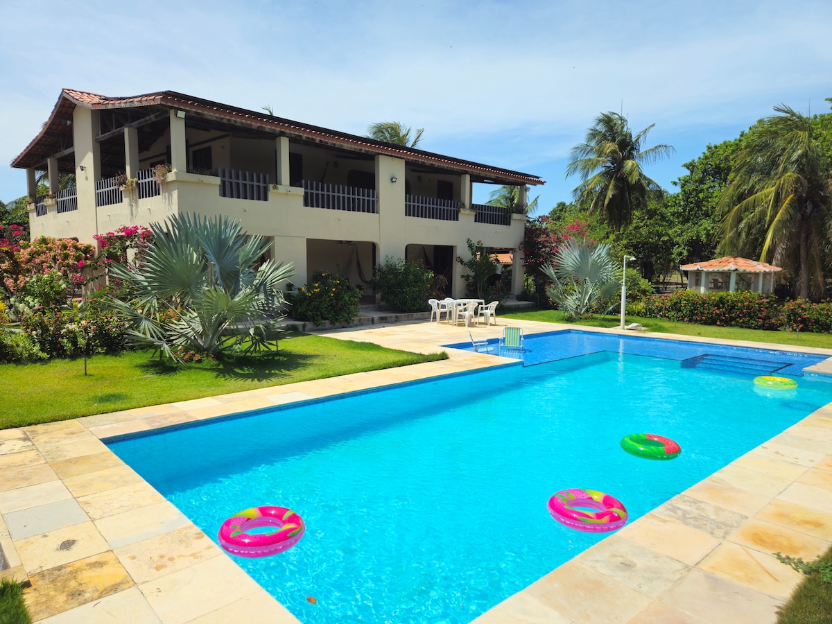 Come and enjoy an unforgettable vacation in our oasis just 300 m from the beach and near the famous Beberibe Cliffs in Ceará, Brazil. Spacious, recently renovated house with 7 bedrooms (6 are suites), all with air conditioning, double beds, and hooks for hammocks. 700 m² of built area, swimming pool, barbecue area, living and dining rooms, and fully equipped kitchen. Have fun in comfort, but please note: loud music, parties, and live bands are not allowed as this is a residential neighborhood.