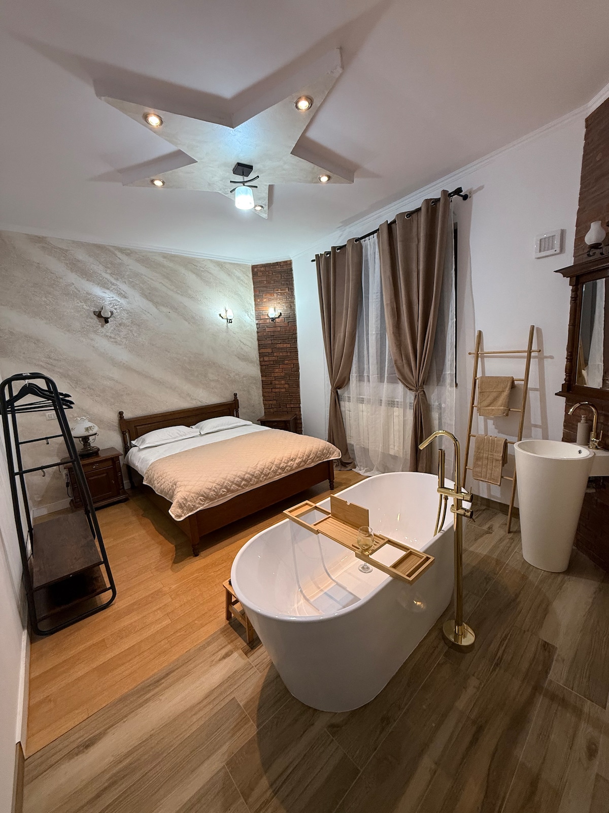 The property is a special and luxurious one. A large open space living room of more than 200 square meters for 5 persons (even 7 persons if there are children) with a double bed , a French style bed (2 persons) , 1 large armchair style bed for 1 person and 2 sofas for 1 person, with 2 bathrooms, romantic bathtub, sauna, fireplace, music speakers, kitchen, SmartTV and free WiFi. The property also has an outdoor terrace with tables and chairs with an area of about 70 square meters.
