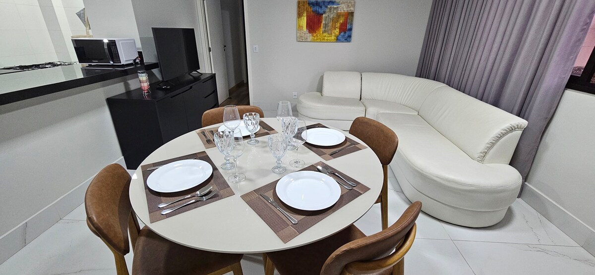Unique, quiet place next to Savassi. NEW apartment, with 2 suites and a toilet. Finely furnished, American kitchen equipped with a full range of utensils. 1 Parking spot Suite 1 - Queen-sized Box Bed, Smart TV, Air-conditioning Suite 2 - Queen-sized Box Bed, Smart TV, Air-conditioning Amenities: Nespresso machine Airfryer Washer and Dryer Ironing board Steam iron Hair dryer Image Blender Air Conditioner Fruit Juicer Mixer etc. 200/400 thread count bedding