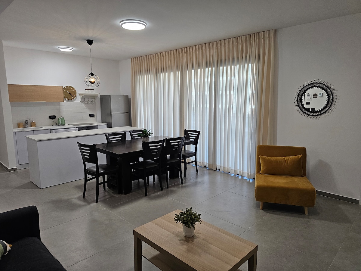 A charming and bright 3-room apartment! Book it for a short and long stay Suitable for an adult couple and families with 2 children and a baby The apartment is located on the first floor of a luxurious and well-maintained building Central location in the Buchman neighborhood! In Modi'in. Opposite a commercial center (grocery store, cafes, restaurants, laundry, synagogues, etc.) 15 minutes drive to the airport. 1. Bedroom (double bed that can be split into 2 separate beds), 2. Clinic with sofa that becomes a bed 3. Large living room. The apartment has a fully equipped and cozy kitchen. The balcony is relaxing and overlooks the courtyard of the building. Central location in the Buchman neighborhood in Modi'in