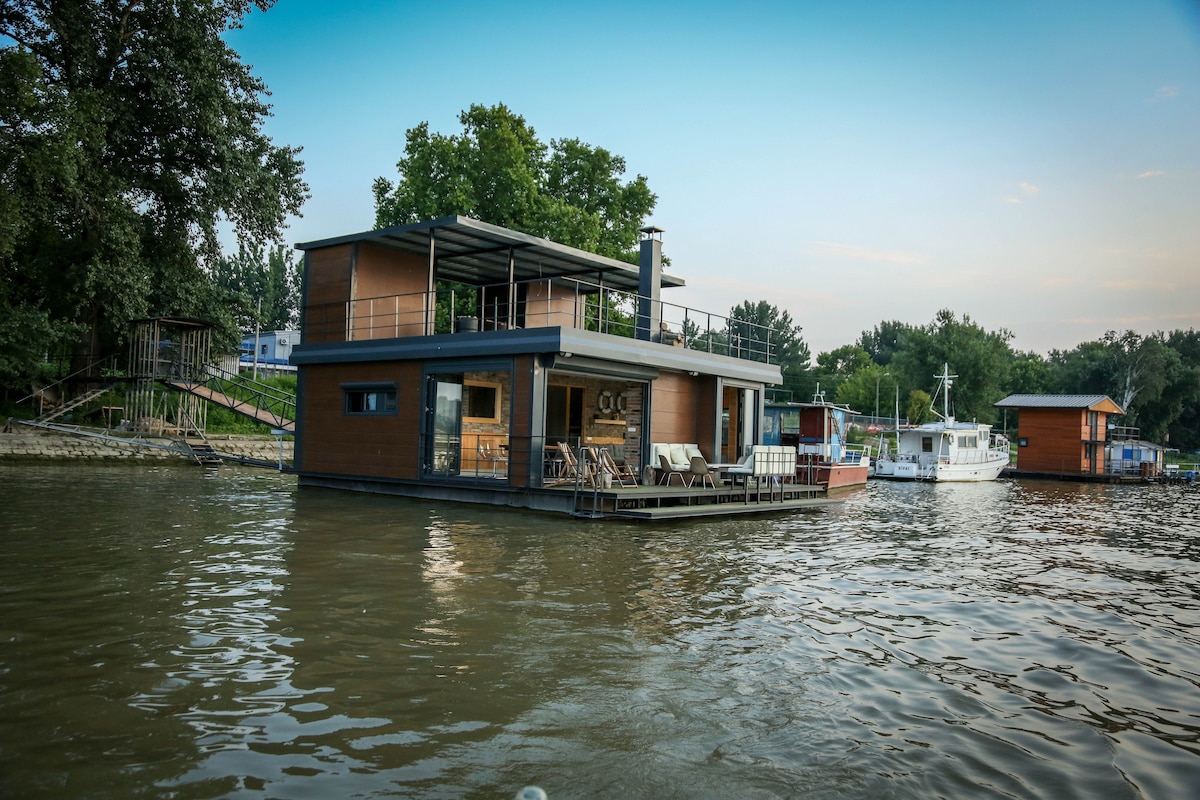 Luxury boat-house on the river Sava. Warm and peaceful ambient with wooden decoration, clean and full of natural light with the amazing view and wonderful nature.5 min walk to the Ada Ciganlija Lake,10 min by car to the city center,25 min drive to the airport. There are so many restaurants nearby.Local driveway to the house. Free parking for our guests !!! In winter idyll you can also enjoy with us, because we are super equipped with heaters, so it is very warm and cozy.
