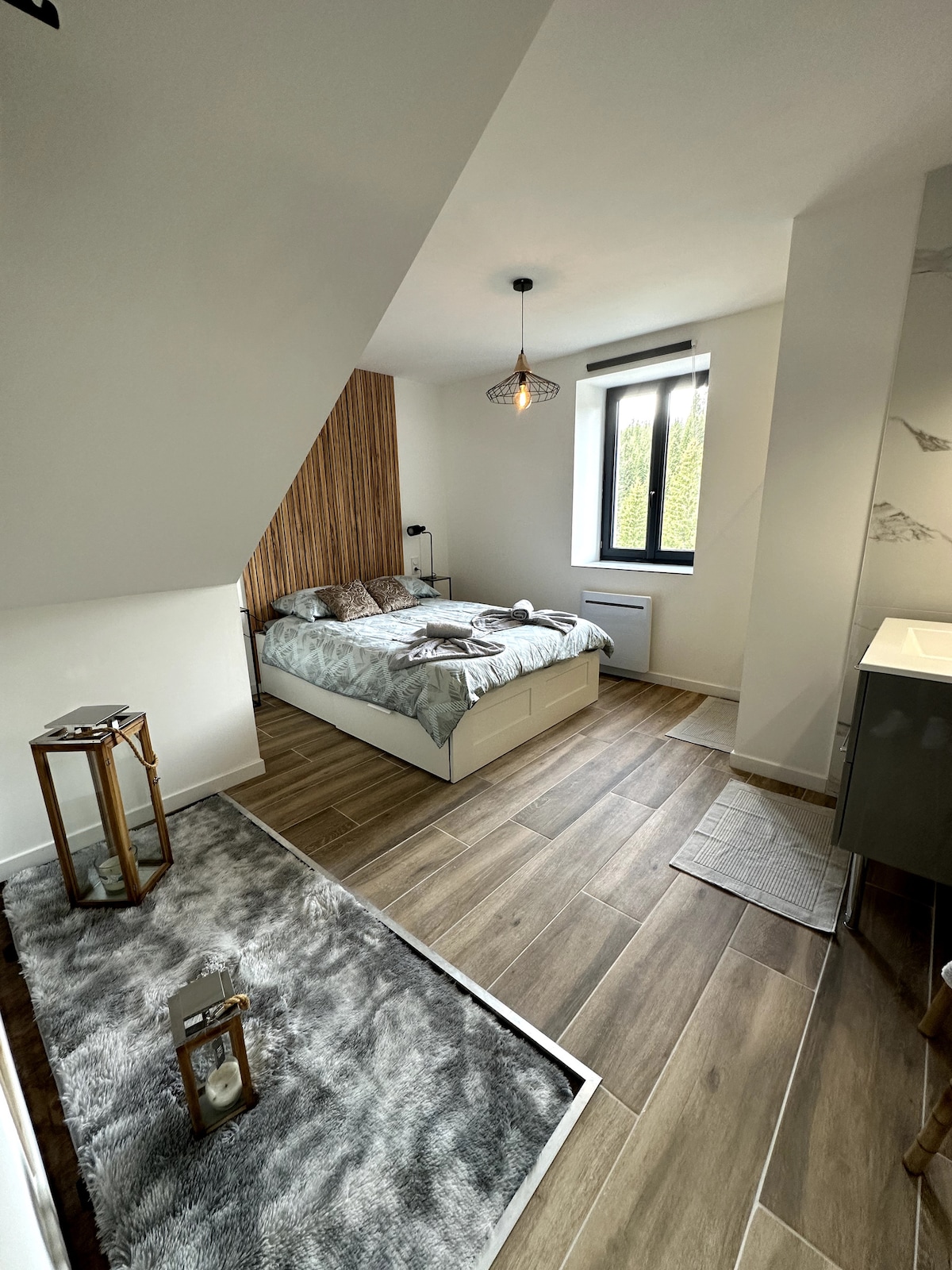 It is nestled in the middle of nature, on the Station des Rousses, where you can stay with your partner or friends and discover a real cozy nest where you can share special moments in a haven of tranquility, authenticity and reconnection. You have a cozy room in a large chalet, with a bathroom, sauna and large terrace, and living spaces, all in a totally private natural setting by the river in the village of Bois d'Amont.