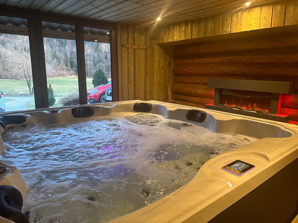 New 120 m2 chalet. The chalet consists of three bedrooms: two with double beds and one with two single beds (possibility of double bed), an extra bed on the mezzanine. Two bathrooms, with walk-in shower. Living room and fully-equipped kitchen Beautiful terrace with stunning valley views and outdoor cedar wood SPA at your disposal. It is located in the small village of Foncine le Haut.