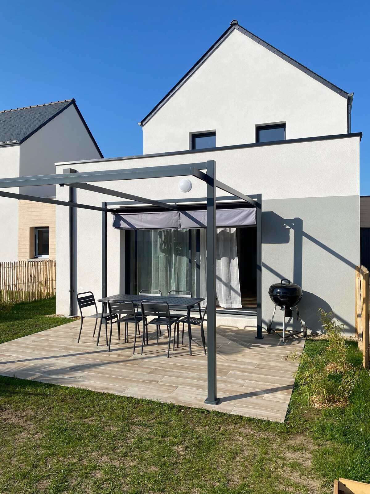 Built in 2019, my house is located in the quiet of a cul-de-sac 750 meters from the beach of the Etel waterbody and shops. It offers a bright living room with sofa bed, (140 x 200), an open equipped kitchen, a bedroom with wardrobe, 160 x 200 bed, a bedroom with 2 90 x 200 beds, a bathroom with toilet, laundry room. New, comfortable and bright interior. Bike storage. Open garden with south-facing terrace, patio with terrace. Barbecue. Private parking. Pets allowed.