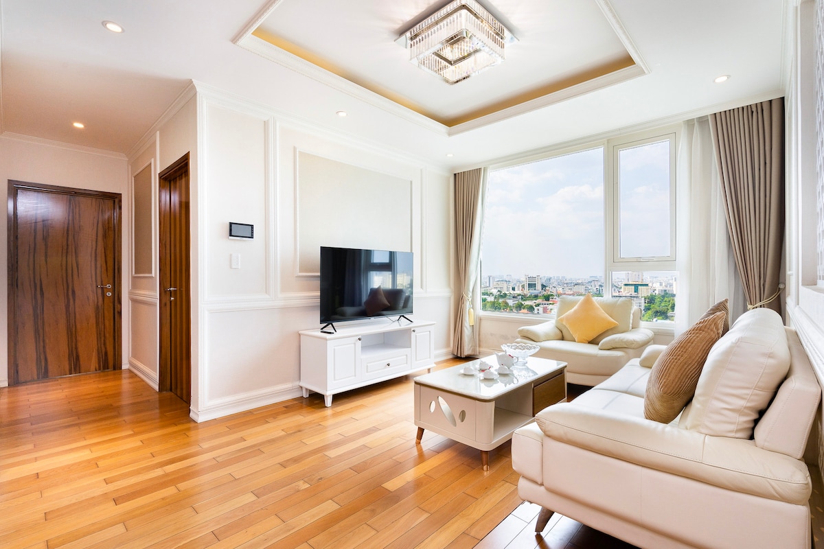 Elevated comfort and style in this luxurious 2-bedroom apartment, perfectly situated on a high floor with sweeping city views. Located near District 1, you're just minutes away from most iconic landmarks, including Ben Thanh Market, Notre-Dame Cathedral, Independence Palace,.. The apartment offers a quiet and peaceful retreat, perfect for families or groups of up to 4. It features 2 spacious king-size beds with high-end mattresses, complemented by elegant furniture and sleek modern appliances.