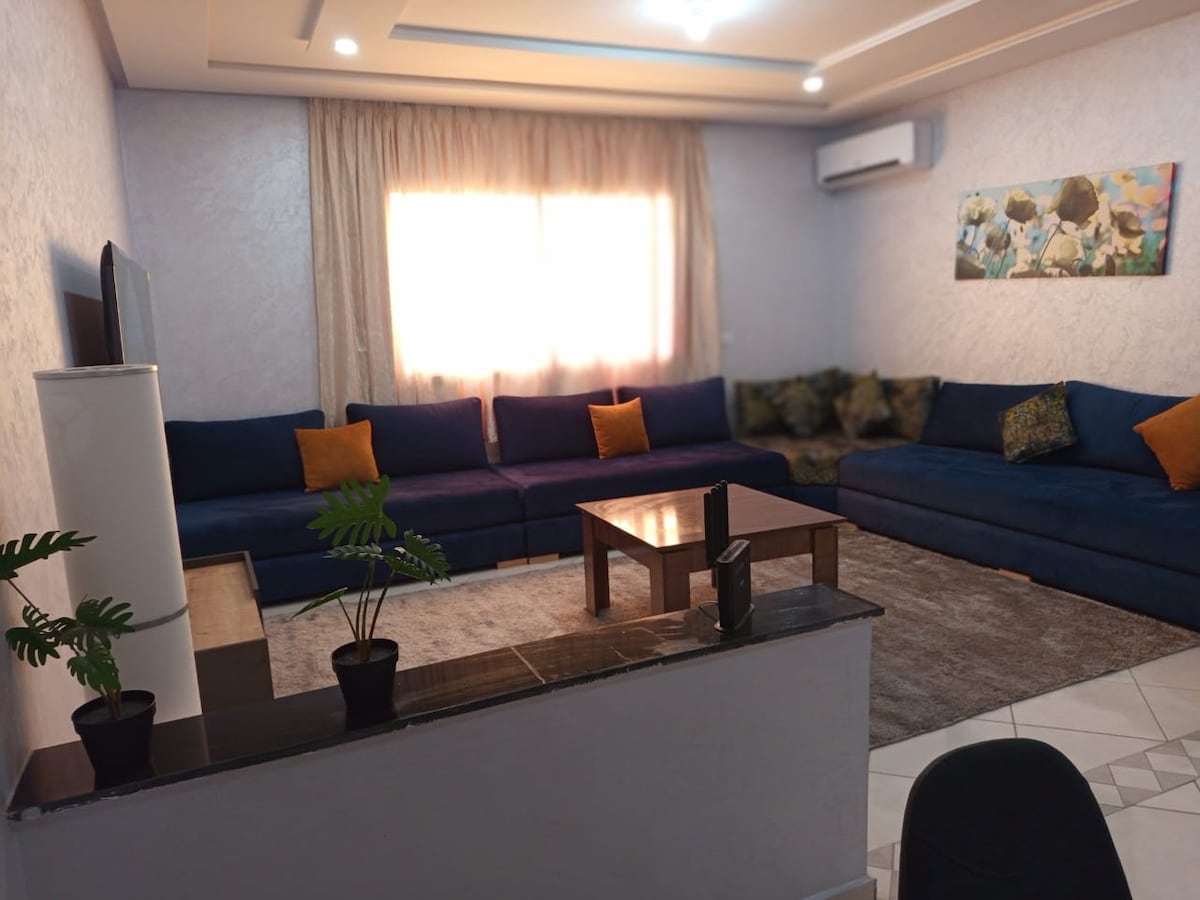Modern and quiet apartment in Beni Mellal, ideal for families or groups. It includes a large Moroccan living room, a small American living room, 2 bedrooms (sleeps 4), a fully-equipped kitchen, a shower and 3 large balconies. Enjoy fibre Wi-Fi, air conditioning, washing machine, connected TV with Netflix and new appliances. Located in a quiet neighborhood, close to shops. - providing me with an identity card is very important. - no alcohol in the accommodation.