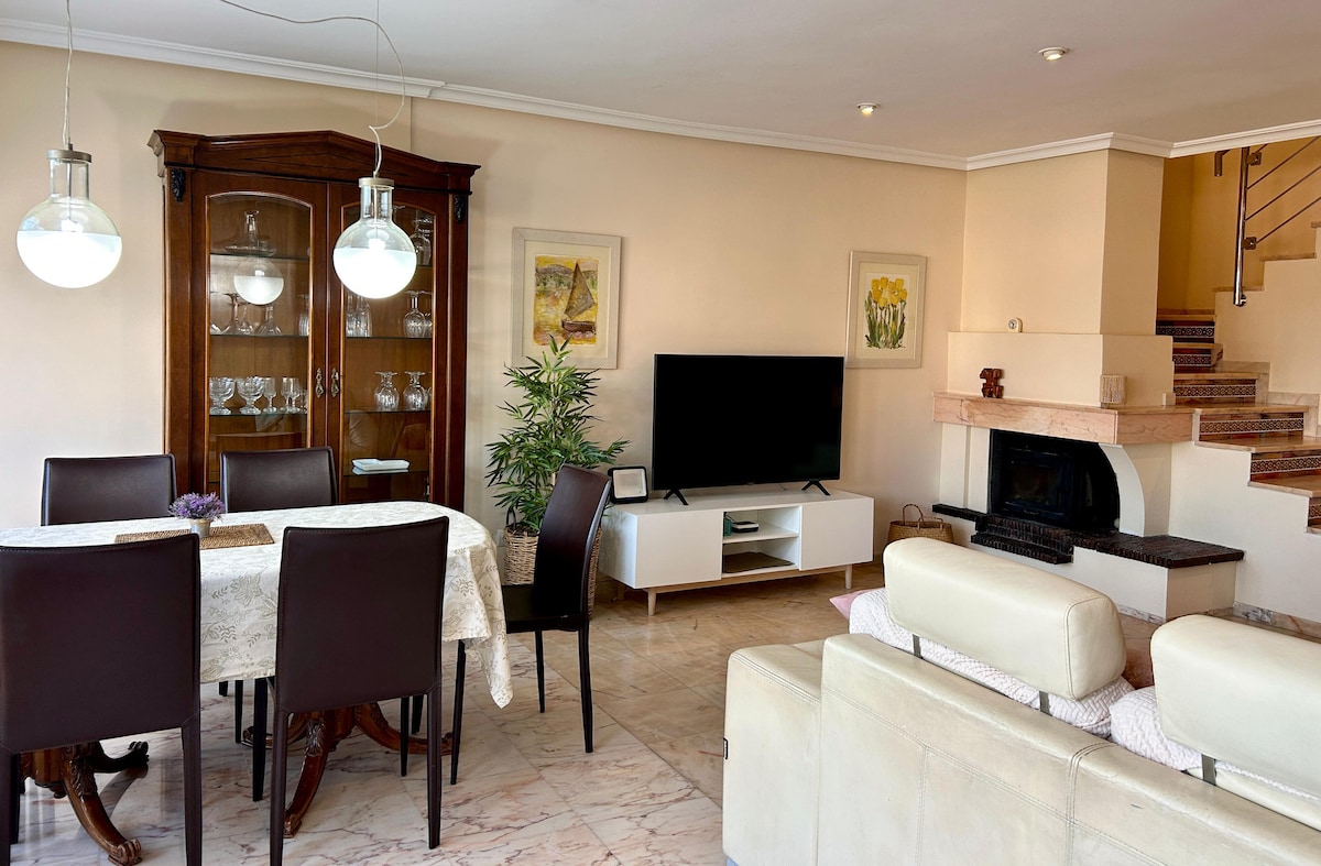 First-line house with ocean views and parking. Entire accommodation for 8 guests: 4 double bedrooms with AC (hot and cold) and 1.35 m beds, living room with sofa bed, 1 bathroom with bathtub, 2 bathrooms with shower and 1 toilet. Workspace Fiber and WiFi throughout the home. Great ocean and development views. Fantastic location: First line facing the sea in Playa de Muchavista. 190m2 available of house on 4 floors. 10,000 m2 of Urbanization with pool, sports area, barbecue, gardens.