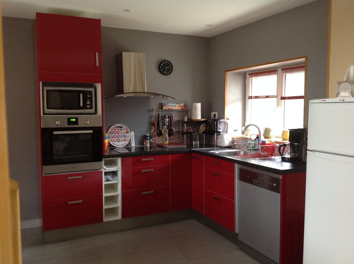 Completely renovated 90 m2 house in Benoîtville, 12 min from Flamanville and 22 min from the Orano factory. 2 bedrooms (2 beds 160 cm Bultex mattress and 1 bunk bed) and a bathroom with spacious shower upstairs. Large living room with fully equipped open kitchen (dishwasher, oven, large smart TV etc...) Laundry room with washing machine and dryer. Sunny outdoor space and parking space. Water, electricity and internet included.
