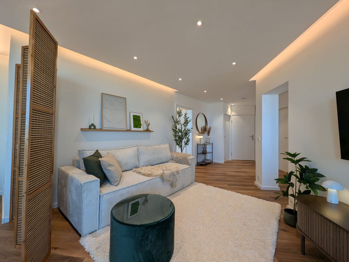 In the Gartenstadt district you will find our newly renovated, high-quality furnished 75 m² apartment. Bathroom with open shower and storage room, living-dining room and kitchen that was built to measure. In the cozy bedroom, a box-spring bed and sofa bed invite you to relax. Guest toilet and cloakroom are also provided. The apartment is fully equipped with electric blinds. Smart TV (55 inches) with cable connection and Netflix available.