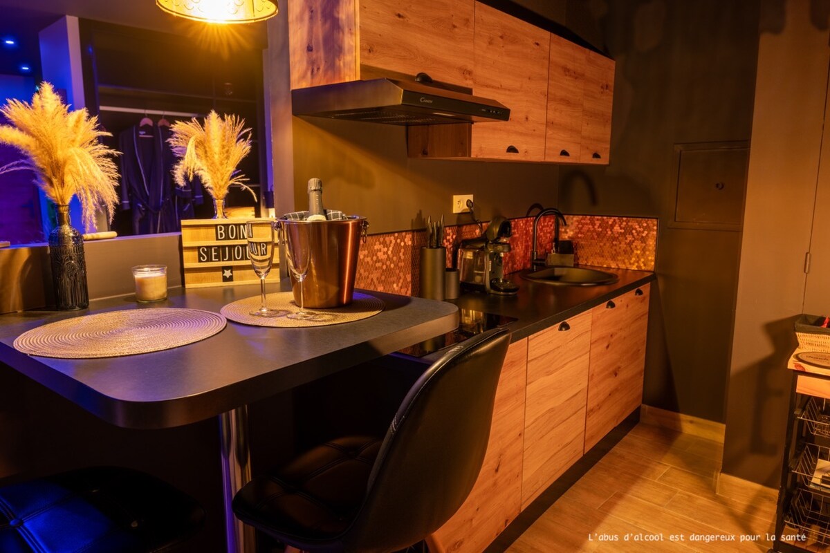 Located in the heart of Bergues. Great for a stay for 2. Enjoy our "Relaxation" area with private jacuzzi and sauna, perfect for relaxing after a day of discovery. The fully equipped kitchen and comfortable living room with Wi-Fi offer all the comforts you need. The spacious bedroom with a king-size bed guarantees restful nights. Located steps from historic attractions and local restaurants, our apartment is the perfect place for a memorable stay.
