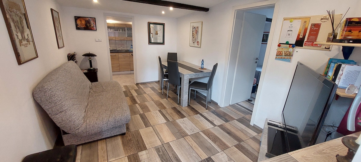 small quiet & cozy cottage with large terrace Bath with shower,double bed in sleeping area Fitted kitchen with dining area, fridge-freezer,dishwasher,TV, Electric fireplace for cozy hours