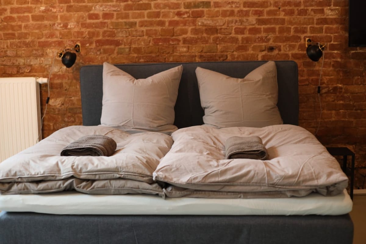 If you are looking for a small and quiet spot 400 meters from the geographic middle point of Berlin than this one might be your first choice! This one room apartment offers 30 square meters in an industrial loft style. Open stone walls, huge comfortable bed, brand new bathroom, breakfast kitchen, vintage furniture and a cozy sofa. The flat is situated in a beautiful planted courtyard of a typical Berlin building in the booming, green part of Kreuzberg.