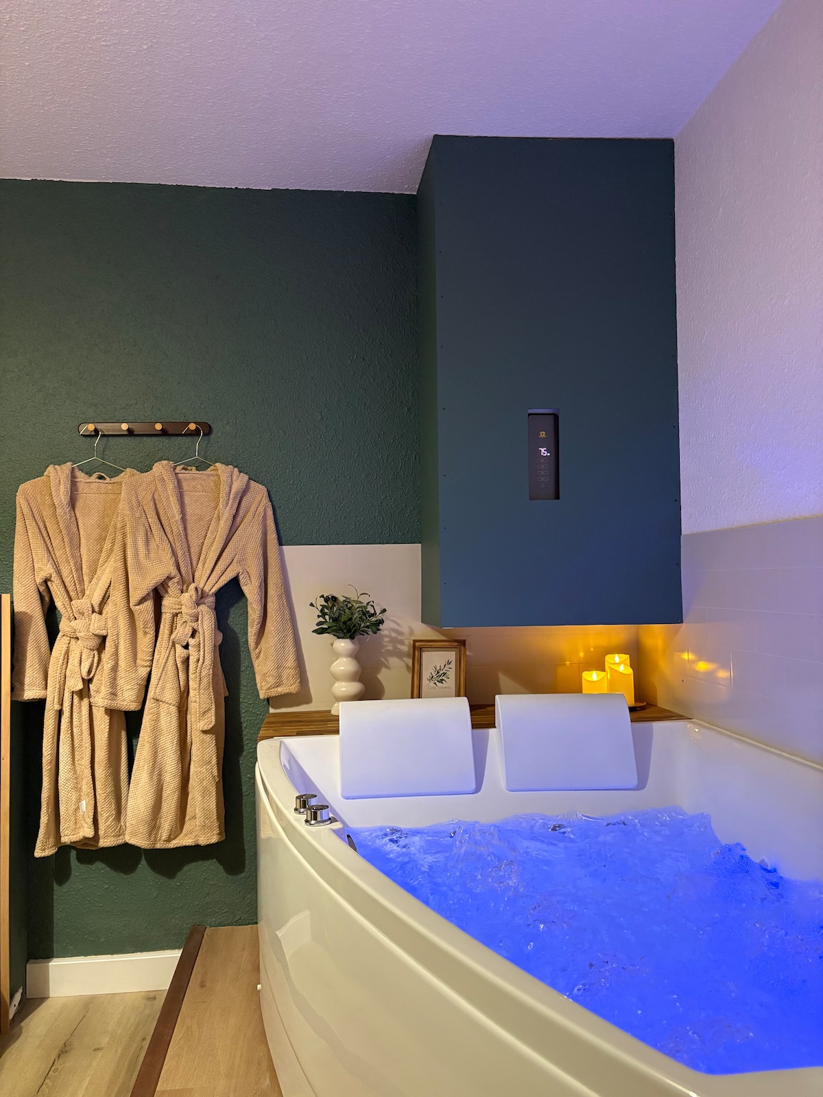 Afro Ethnic - Suite & Spa est une suite atypique à Nîmes inspirée d’un univers afro tribal et zen chic. Tons naturels et ambiance douce, minérale en béton ciré créent une véritable bulle de détente unique à deux. Au rez-de-chaussée, un espace bien-être avec baignoire balnéo ronde, nettoyée après chaque séjour, chaise longue et Smart TV 98 pouces pour regarder vos films. À l’étage, un espace de vie chaleureux sous les combles. Logement calme, idéal pour une parenthèse dépaysante.