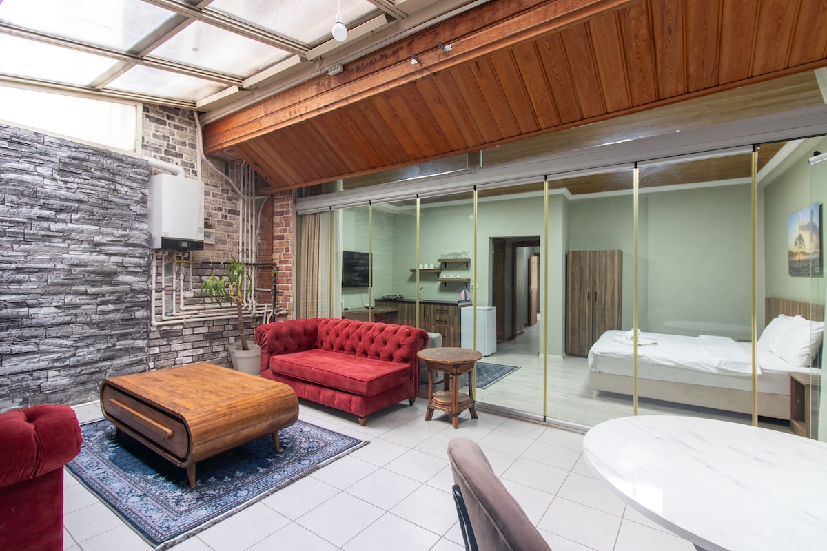 This unique apartment is in our modern boutique hotel in Ortaköy, Istanbul, just a 2-minute walk from Ortaköy Coast, the iconic Bosphorus Bridge, Ortaköy Mosque, and popular kumpir and waffle shops. It features a spacious bedroom, a living room, and a private backyard garden fully furnished for outdoor relaxation. With two air conditioners, a fully equipped kitchen, a washing machine, and a 40-inch TV, the luxurious and modern design ensures a comfortable stay for two guests.