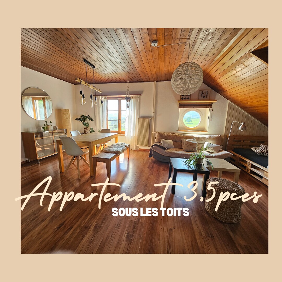 New 2.5 room apartment (70 m2) in the attic of a renovated farmhouse on the edge of the village in a quiet environment and surrounded by nature. At your disposal is a large room comprising the living room with modern and fitted open kitchen. A bedroom for 2 people. Bathroom with toilet and bathtub. Large terrace with garden furniture and barbecue and stunning views of Mont-Raimeux