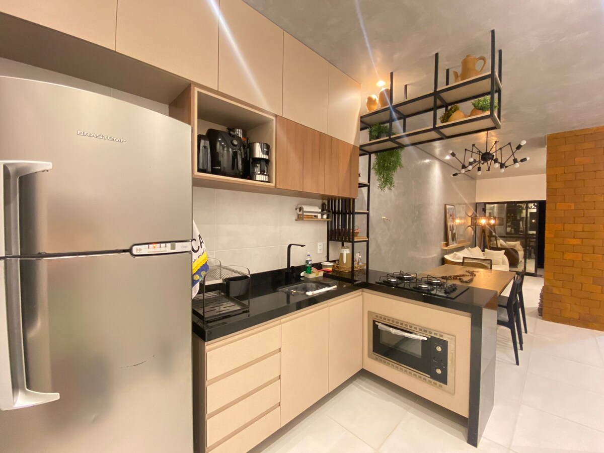 It doesn't even look like a flat! With 72m2, spacious, well decorated and full of positive energy. Located at Hotel Fazenda Monte Castelo, with free access to leisure areas (swimming pools, kids' space, sports courts, park, small farm). Perfect for babies and children of all ages. You can visit nearby cities such as Gravatá, Bezerros and Bonito. Hike, nap in the hammock, gather the family, have a glass of wine, ride and even work from home, enjoying the coolness of the mountains. Maid service.