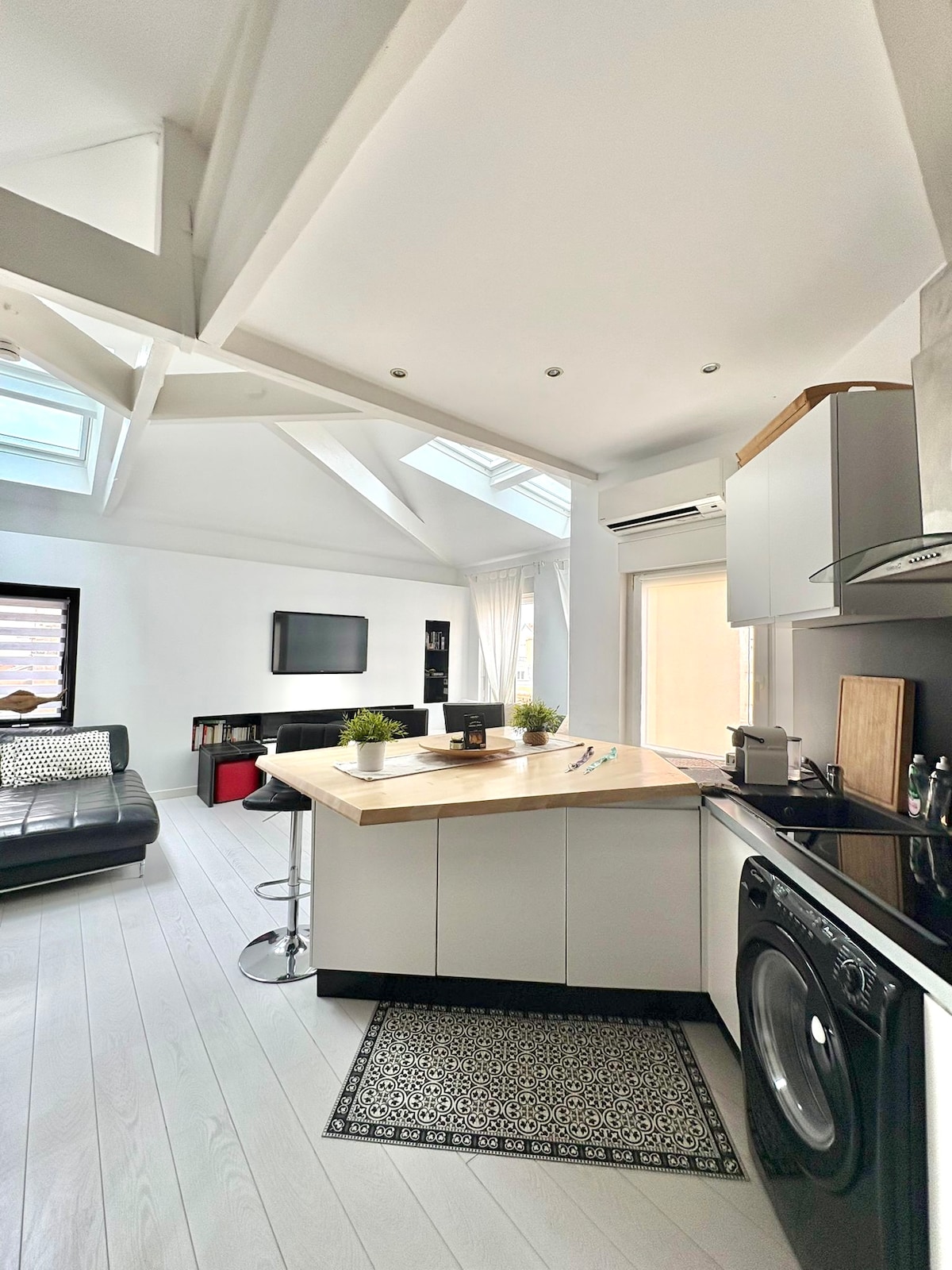 Anglet Aguilera, at the entrance to Biarritz, close to Bayonne, and minutes from the center of Biarritz and its large beach or the beaches of the Chambre d'Amour in Anglet. Nice atypical loft completely renovated in June 2022, very bright, located on the 2nd floor without elevator of a large Basque house with digicode Located under the roofs, it is a spacious, comfortable, air-conditioned, and very well-equipped apartment All shops & tram bus at the foot of the residence, pizzeria on the ground floor
