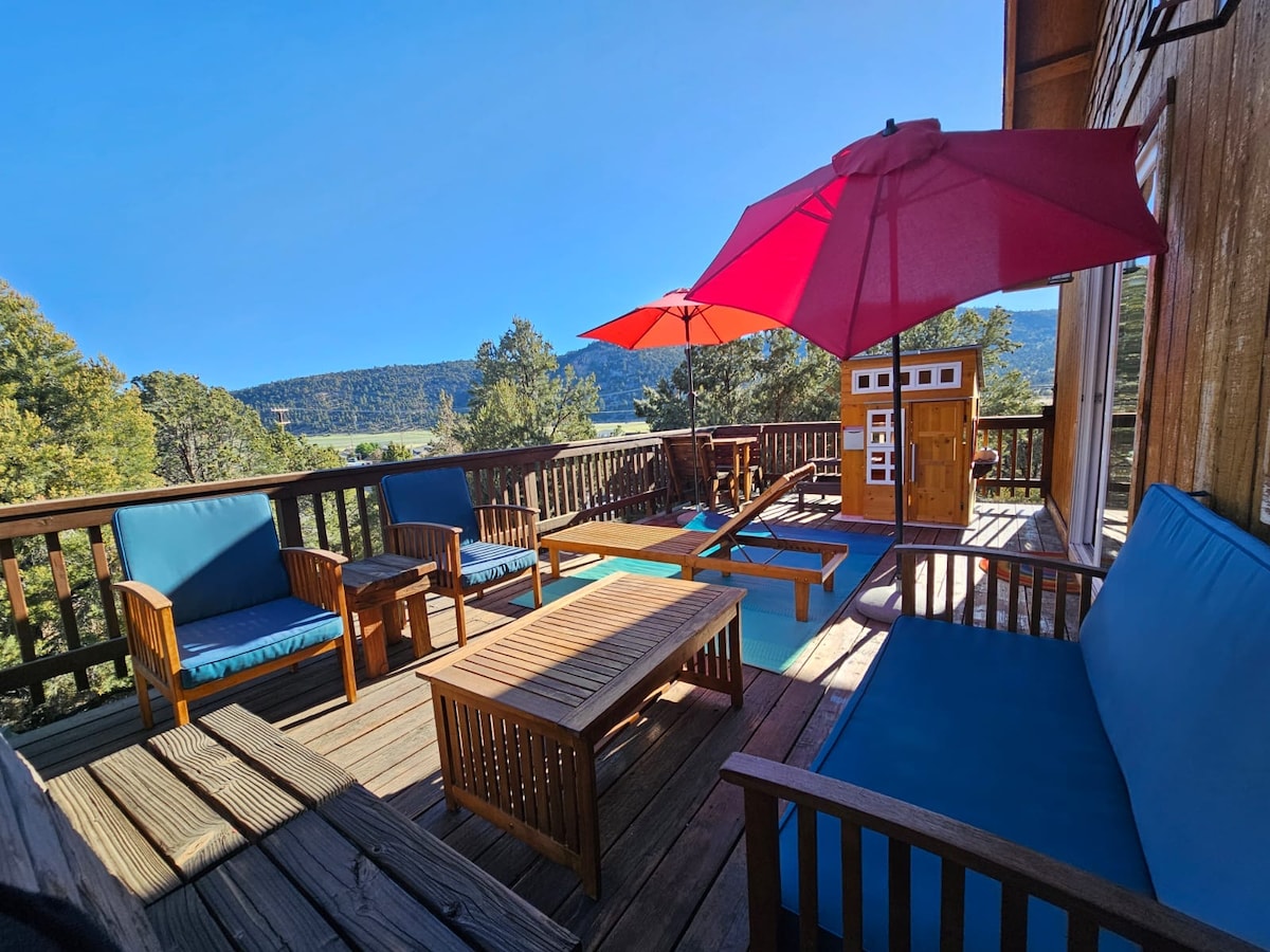 Snowboarder’s Dream Cabin- 7 minute walk to Bear Mountain Stay in this cozy 2-bedroom cabin, just 0.4 miles from Bear Mountain Ski Resort, Golf Course, and Alpine Zoo. Surrounded by trees, privacy and space. This serene retreat features 1 king bed, 3 twin beds, a fireplace, and a private balcony with firepit to take in the forest views. Perfect for snowboarders, skiers, hikers, bikers and stargazers alike—unwind in style after a day of adventure! Pet Friendly ($40 pet fee if bringing a pet)